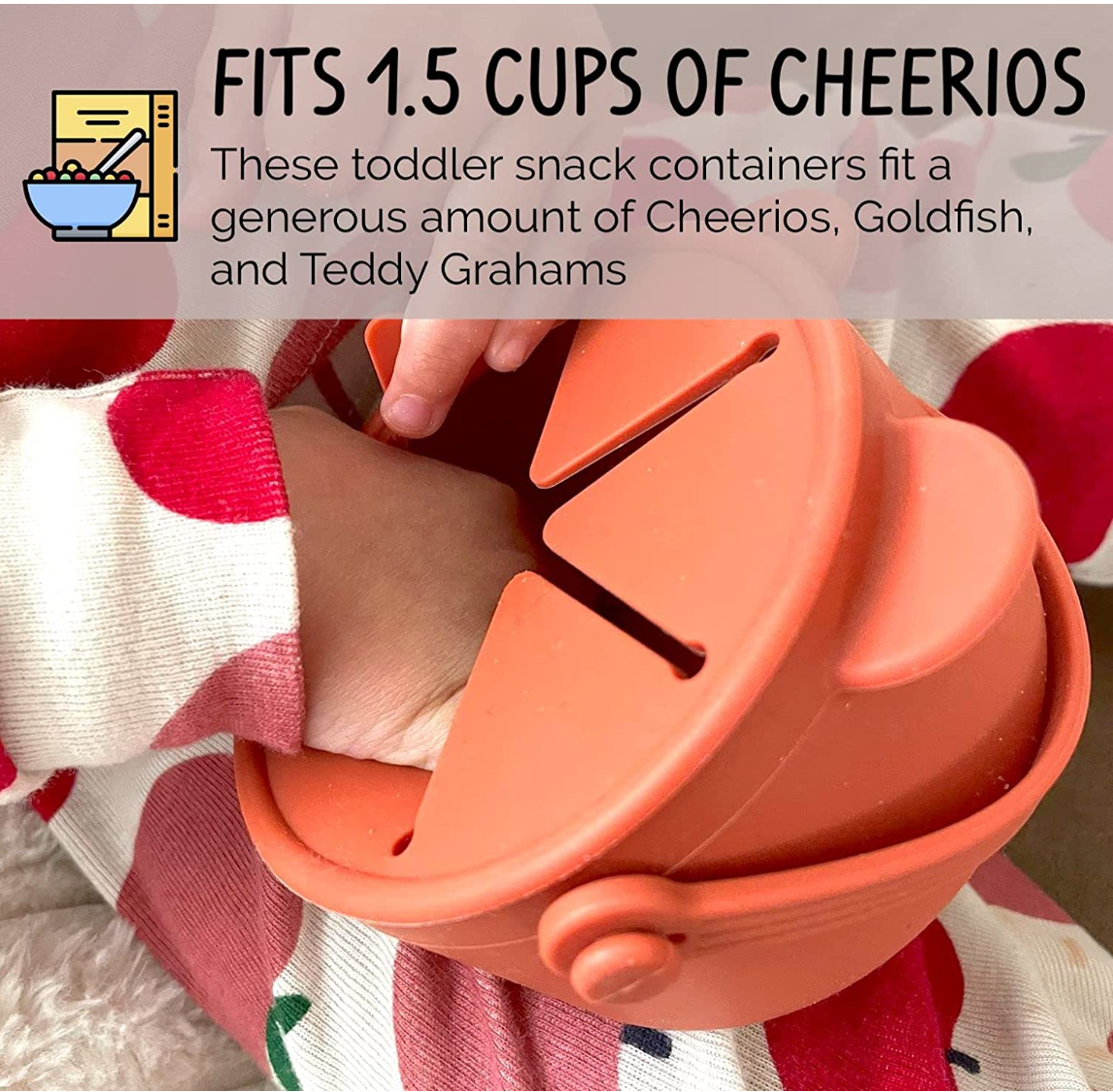 These toddler snack containers fit a generous amount of Cheerios, Goldfish, and Teddy Grahams